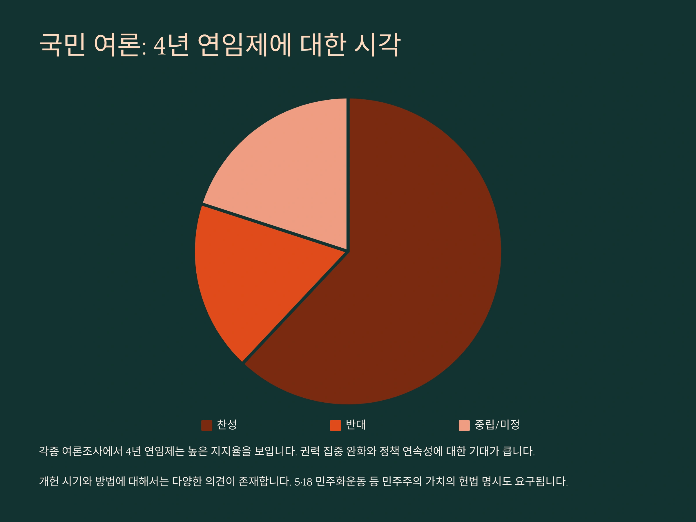 4년 연임제에 대한 국민 여론은 정부와 정치권에서 중요한 근거로 활용되고 있습니다. 2018년 문재인 정부는 여론조사 결과를 바탕으로 4년 연임제에 대한 국민적 지지를 강조했습니다. 당시 조사에서 4년 연임 또는 중임제가 다른 제도보다 압도적인 지지율을 기록했다고 발표했습니다.