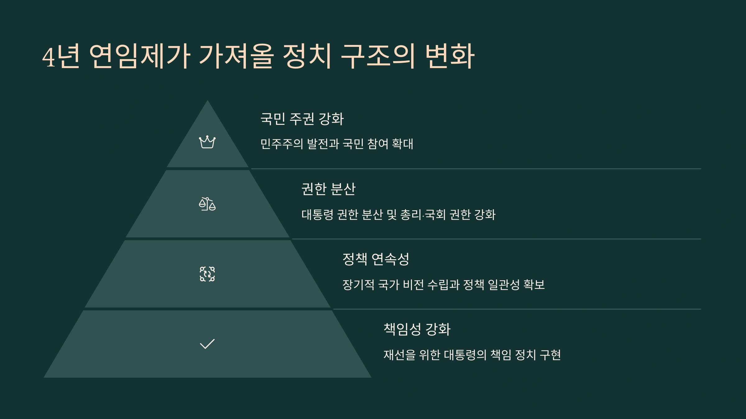 4년 연임제의 핵심은 임기 단축과 함께 책임 있는 정치를 실현하는 데 있습니다. 재선 가능성이 있기 때문에 국민 평가에 더 민감하게 반응할 수밖에 없는 구조입니다.