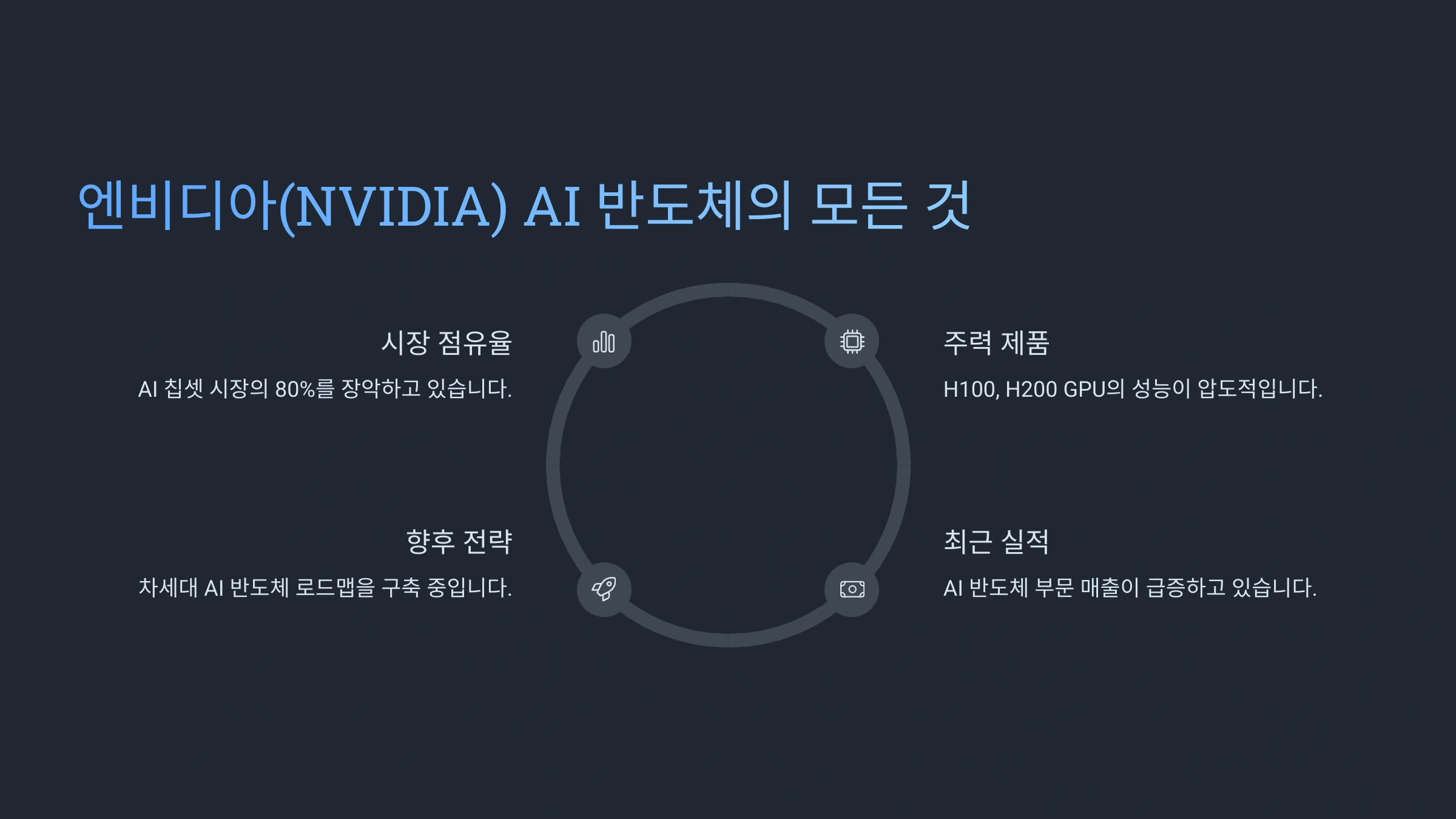 엔비디아는 2025년 AI 반도체 시장에서 독보적인 1위 기업으로 자리매김하고 있습니다. 데이터센터용 GPU 공급을 주력으로 하며, 2024년에는 매출 900억 달러와 순이익 300억 달러라는 놀라운 실적을 기록했습니다. 특히 HBM(고대역폭 메모리) 기술을 통해 AI 칩 성능을 혁신적으로 향상시키고 있습니다.