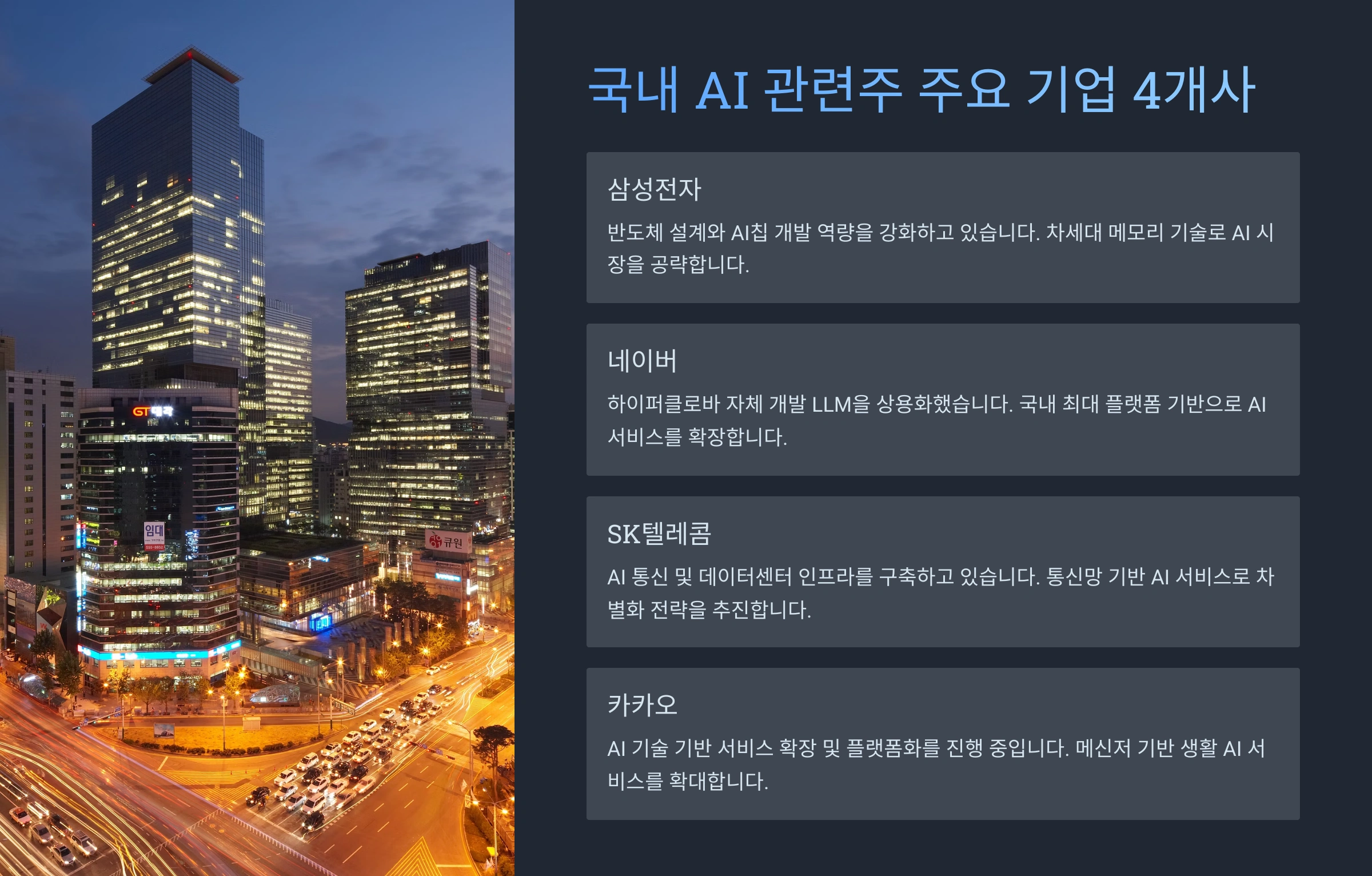 | 3 | SK텔레콤 (017670) | AI 데이터센터 구축 및 5G/6G와 AI 융합 서비스를 개발하고 있습니다. |