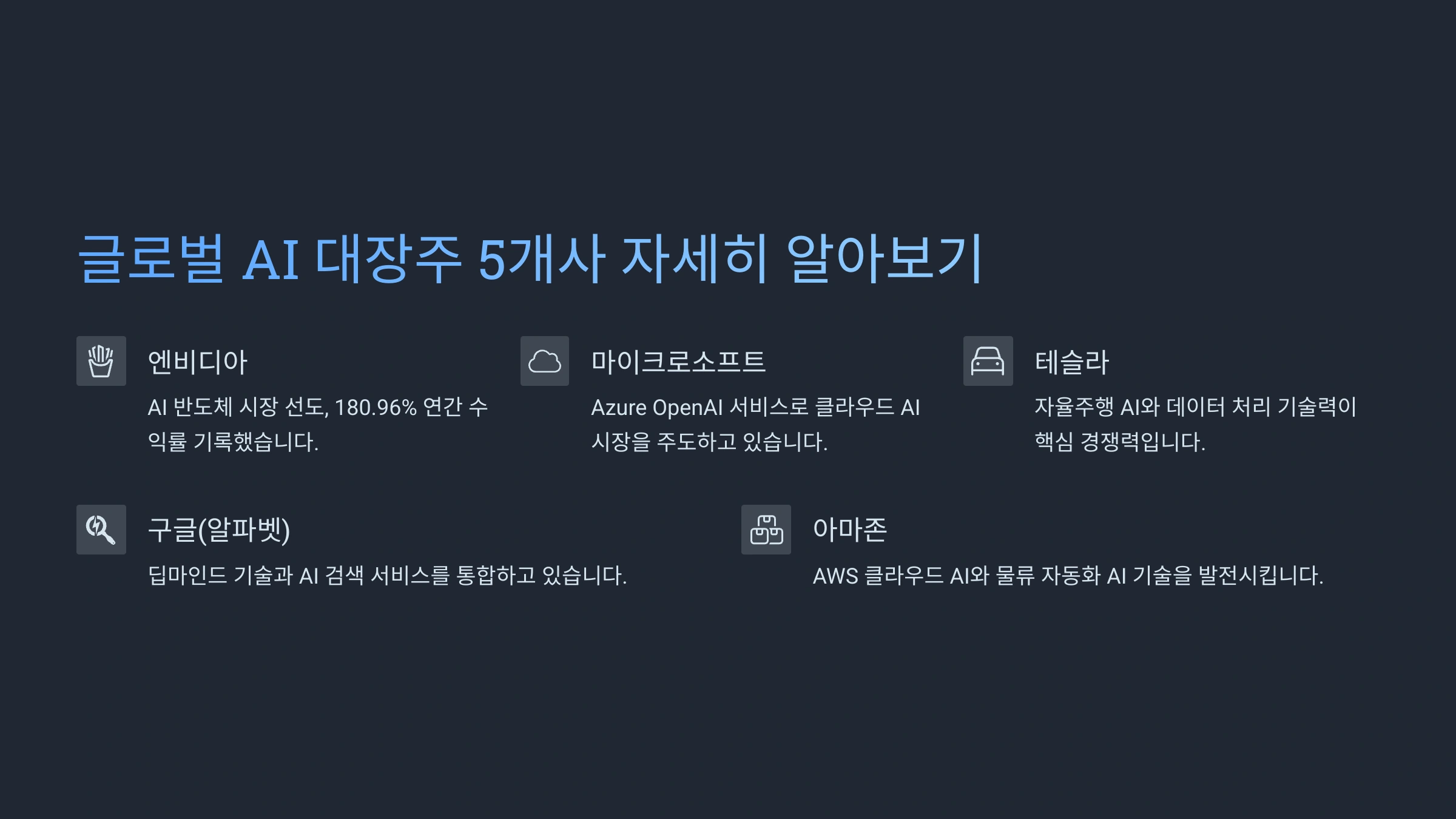 | Amazon | 클라우드, 물류 AI | AWS AI 서비스 다각화 | 물류 최적화 AI 솔루션 성장 |