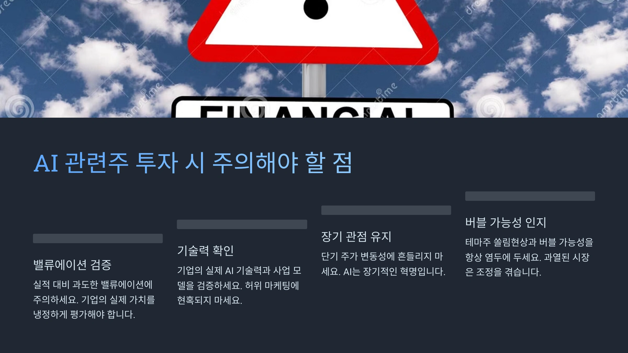 다양한 AI 관련주에 분산 투자함으로써 리스크를 줄이고, 장기적인 성장 가능성에 초점을 맞추는 전략이 효과적일 수 있습니다.