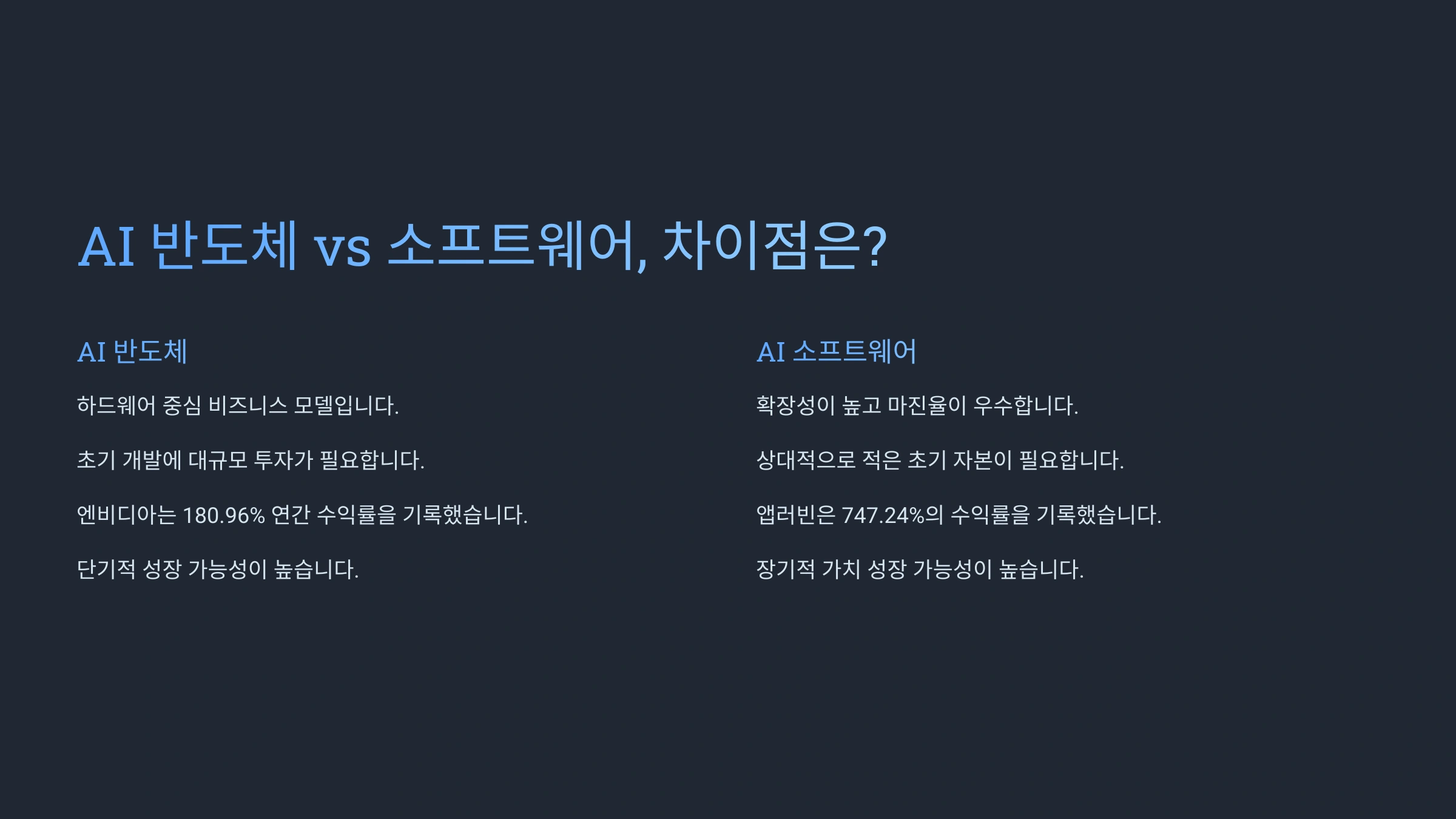 두 영역은 상호보완적이며, 균형 잡힌 투자 포트폴리오를 구성하려면 반도체와 소프트웨어 기업 모두에 관심을 가질 필요가 있습니다.