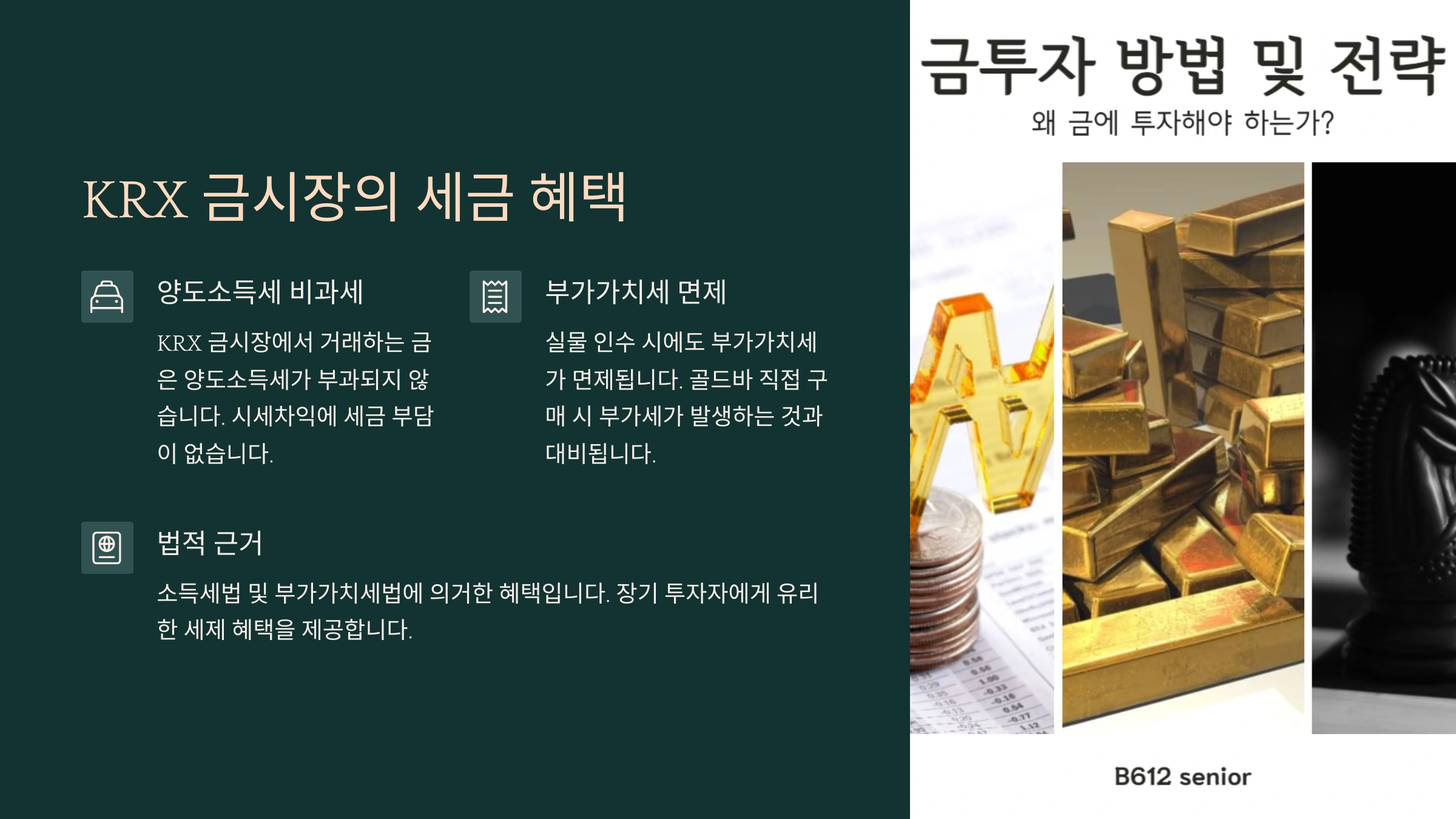 KRX 금투자방법의 가장 큰 특징은 세금 혜택입니다. 거래 시 양도소득세, 배당소득세, 부가가치세가 모두 면제됩니다. 다만, 실물 금을 직접 인출할 경우에는 부가가치세 10%가 부과된다는 점을 염두에 두어야 합니다.