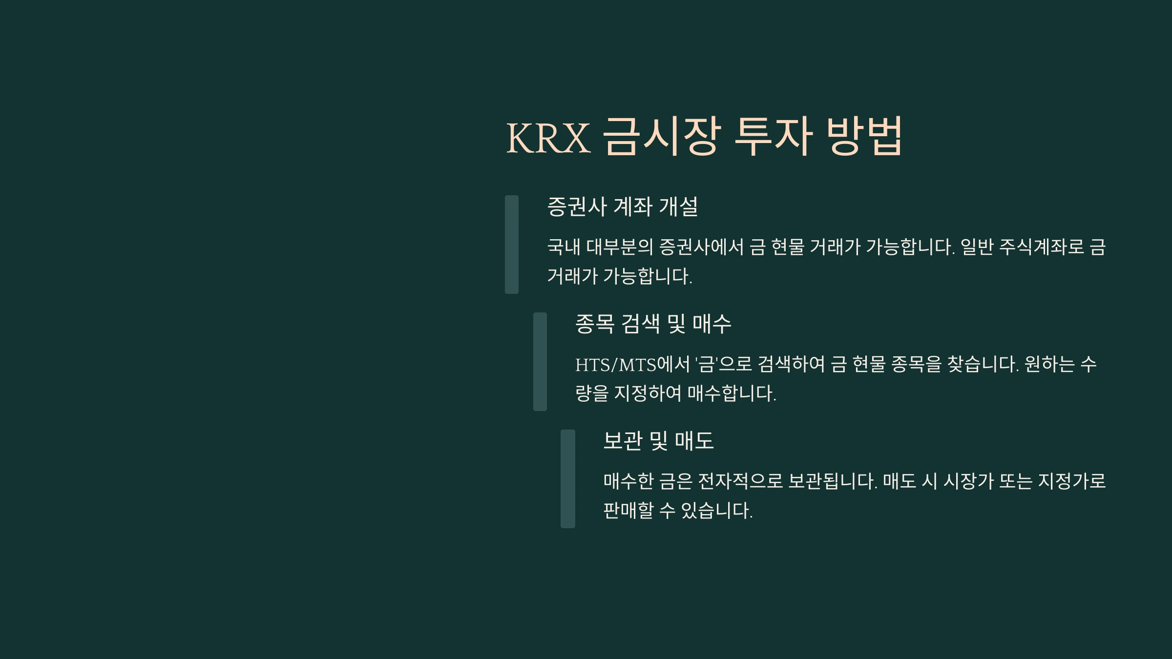 KRX 금투자방법은 생각보다 간단합니다. 먼저 증권사에 금 현물 전용 계좌를 개설해야 합니다. 대부분의 주요 증권사에서 서비스를 제공하므로 본인이 선호하는 증권사를 선택하면 됩니다.