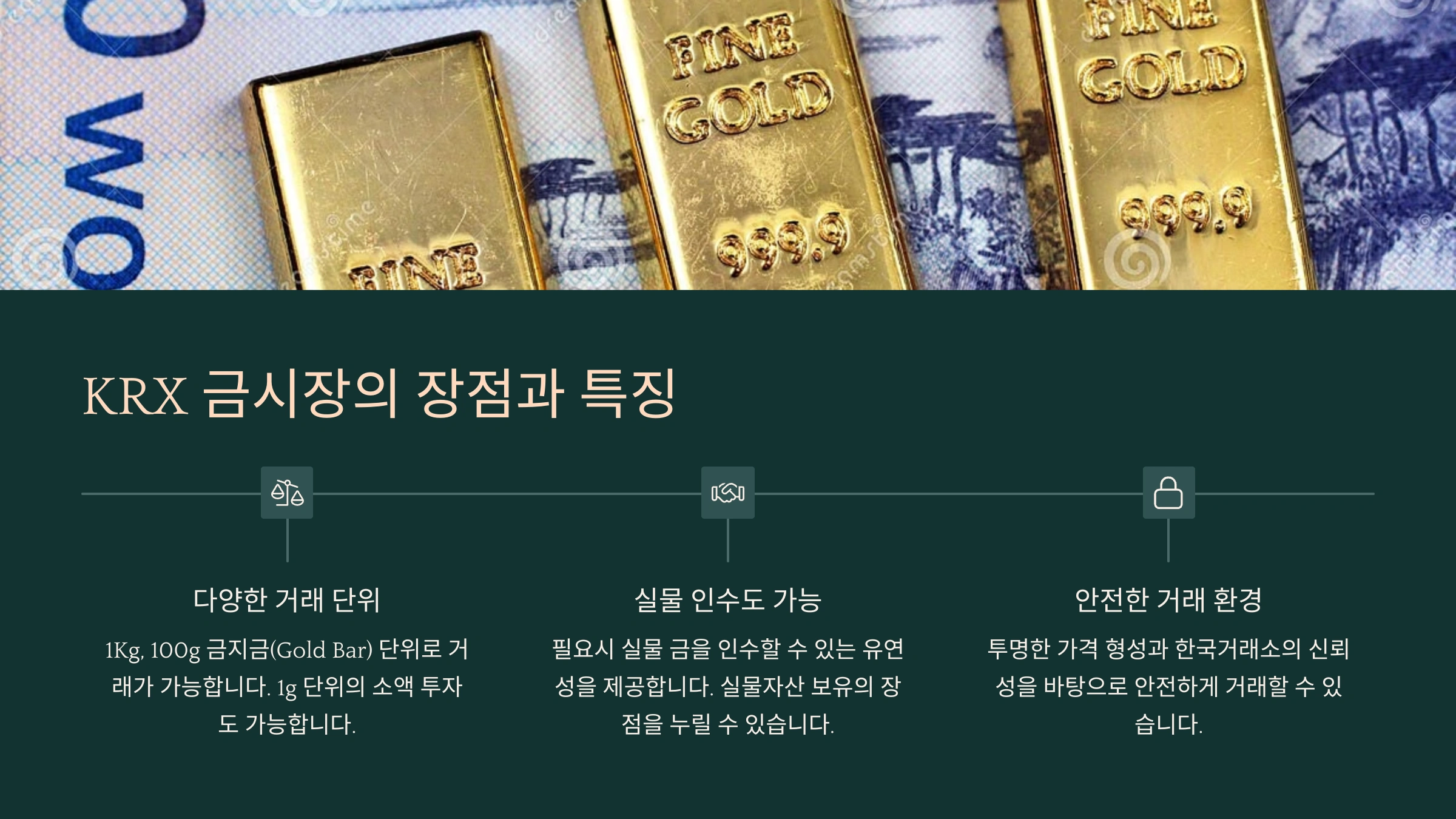 KRX 금투자방법은 소액 투자자들에게 특히 매력적입니다. 단 1g부터 거래가 가능하기 때문에 부담 없이 시작할 수 있습니다. 금 가격이 높아도 소액으로 투자할 수 있다는 점이 큰 장점입니다.