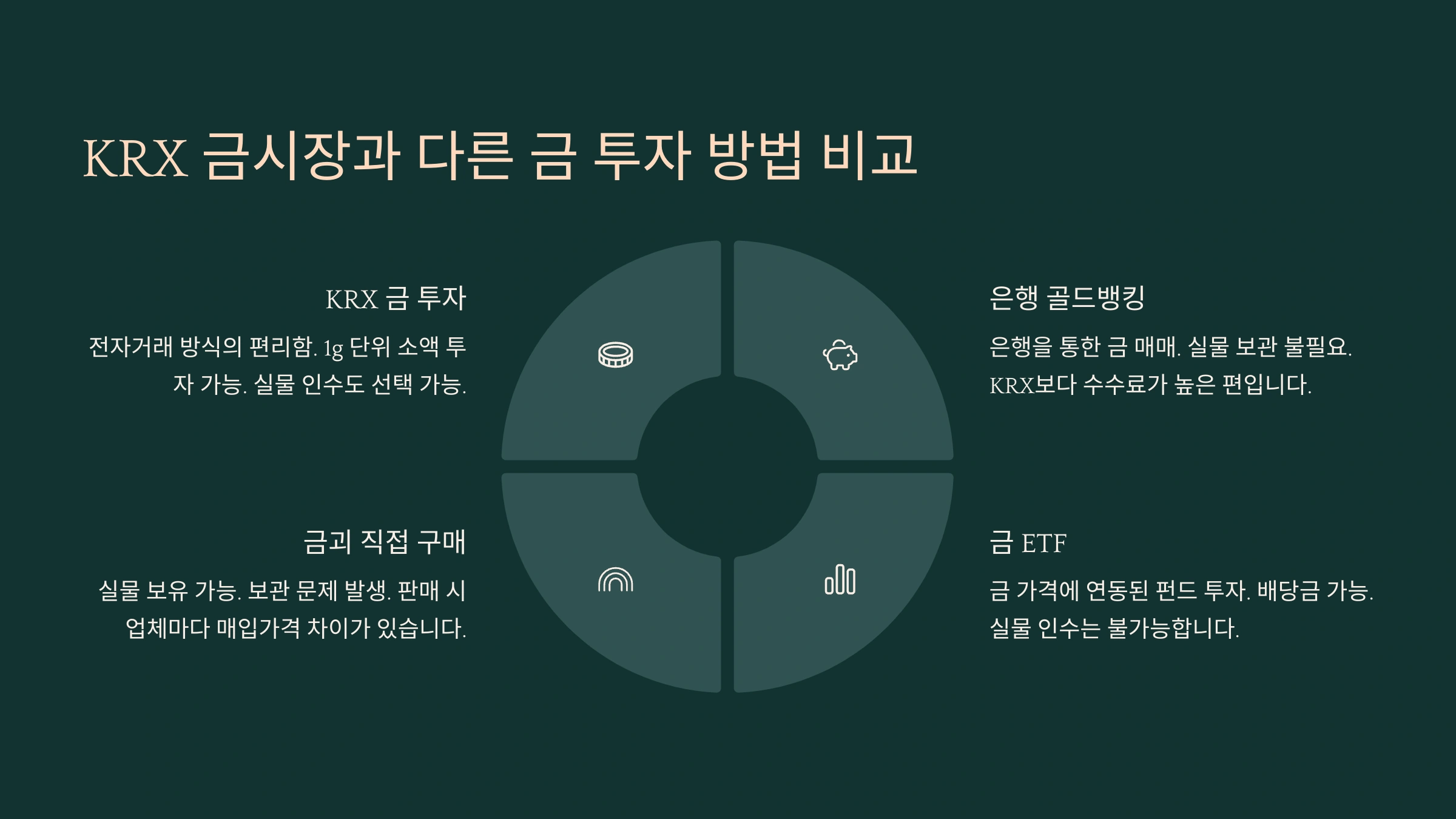 KRX 금투자방법은 세금 효율성과 소액 접근성 측면에서 우수합니다. 반면, 골드바는 실물 금을 직접 보유하고 싶은 투자자에게 적합합니다. 골드 뱅킹은 더 작은 단위(0.01g)로 투자할 수 있지만, 세금 부담이 높습니다. 금 ETF는 금 가격 변동에 따른 헤지 수단으로 활용하기 편리하지만, 운용 수수료가 발생합니다.